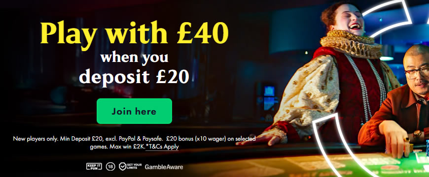 New players only. Min Deposit £20, excl. PayPal & Paysafe. £20 bonus (x10 wager) on selected games. Max win £2K. T&Cs apply.New players only. Min Deposit £20, excl. PayPal & Paysafe. £20 bonus (x10 wager) on selected games. Max win £2K. T&Cs apply.