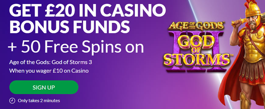 18+ New customers only.Opt in, deposit & wager £10+ on selected games within 7 days of registration. Get £20 in Casino Bonus Funds (10x wagering. Max withdrawal £250) + 50 Free Spins for Age of the Gods: God of Storms 3. 30 days expiry. T&Cs apply, see below. gambleaware.org | Please gamble responsibly